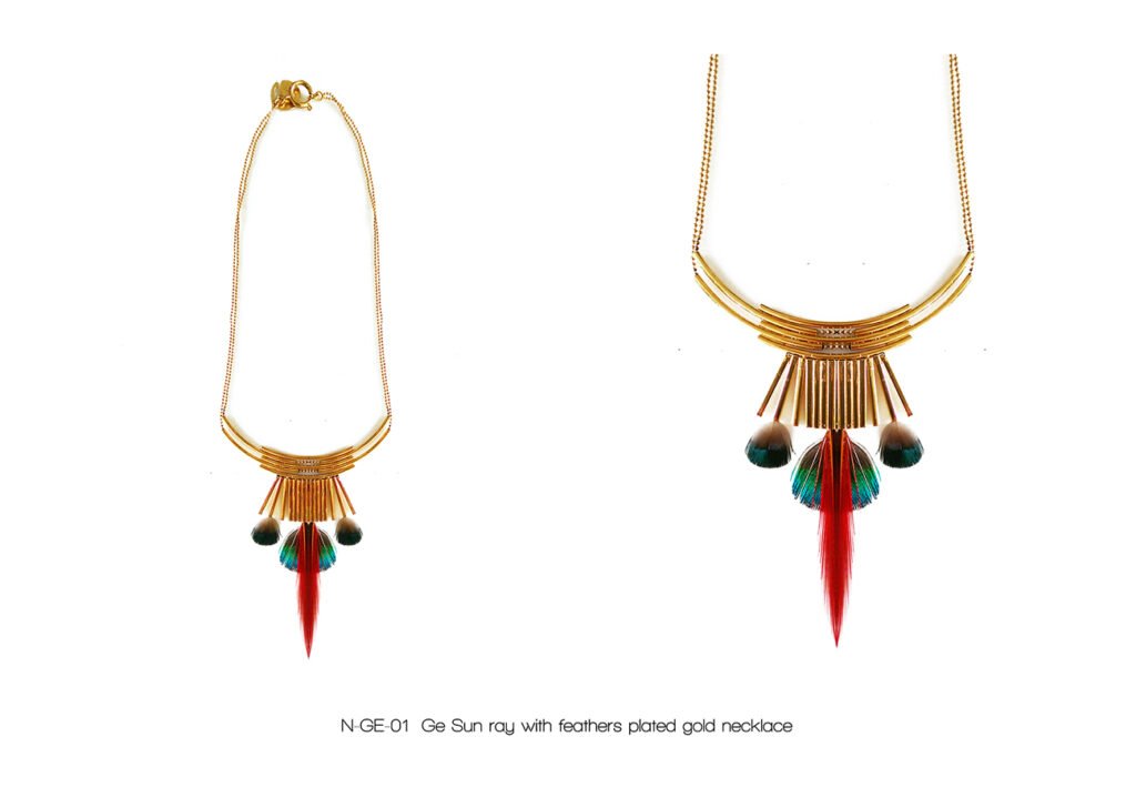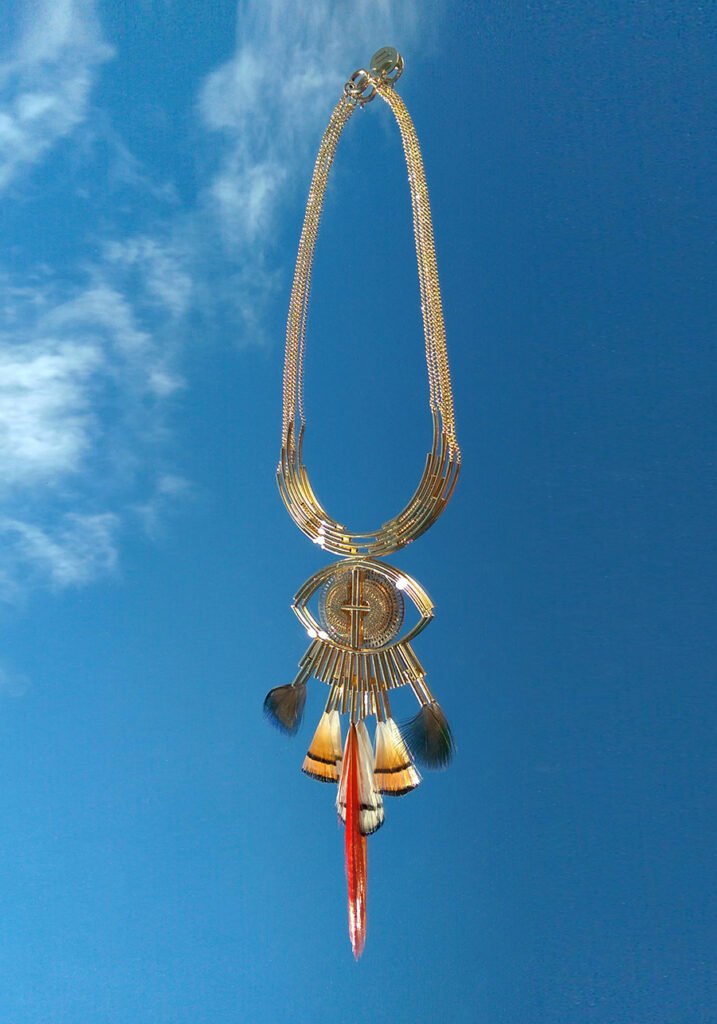 Raoni necklace in 24 carat gold plated brass, feathers of Pheasant, Peacock and Indian Roller.