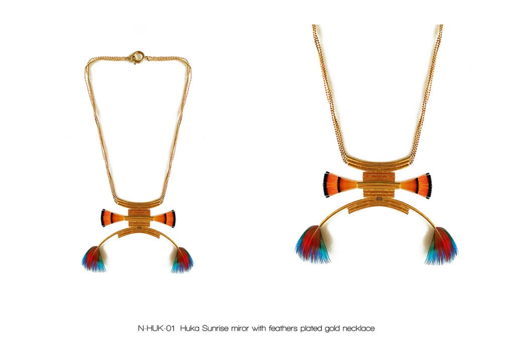 La collection « Kayapo Amazonia » est un hommage rendu aux indiens d’Amazonie et leurs magnifiques coiffes de plumes, symbole de connaissance et de spiritualité. Les Kayapo et les autres tribus vivant dans la forêt amazonienne font aujourd’hui partie des peuples conservateurs de notre planète Terre. Mon hommage tend à mettre en exergue la beauté de leur geste.