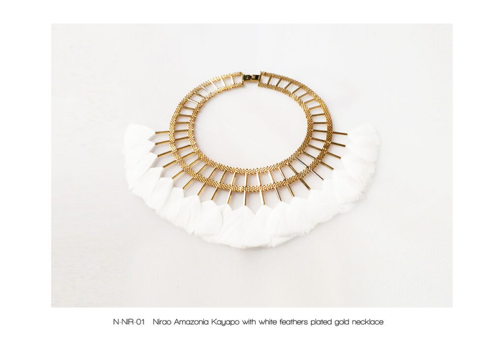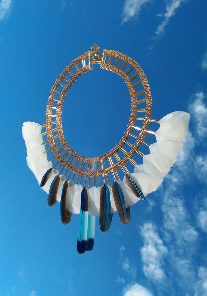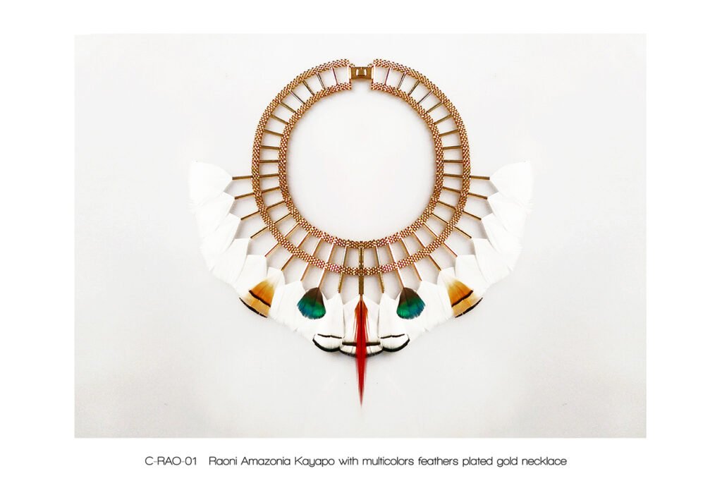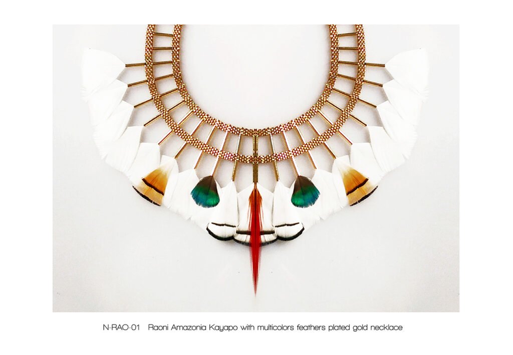 The « Kayapo Amazonia » collection is a tribute to the Amazonian Indians and their beautiful feather headdresses, symbol of knowledge and spirituality. The Kayapo and other tribes living in the Amazon rainforest are today part of the conservative peoples of our planet Earth. My tribute tends to highlight the beauty of their gesture.