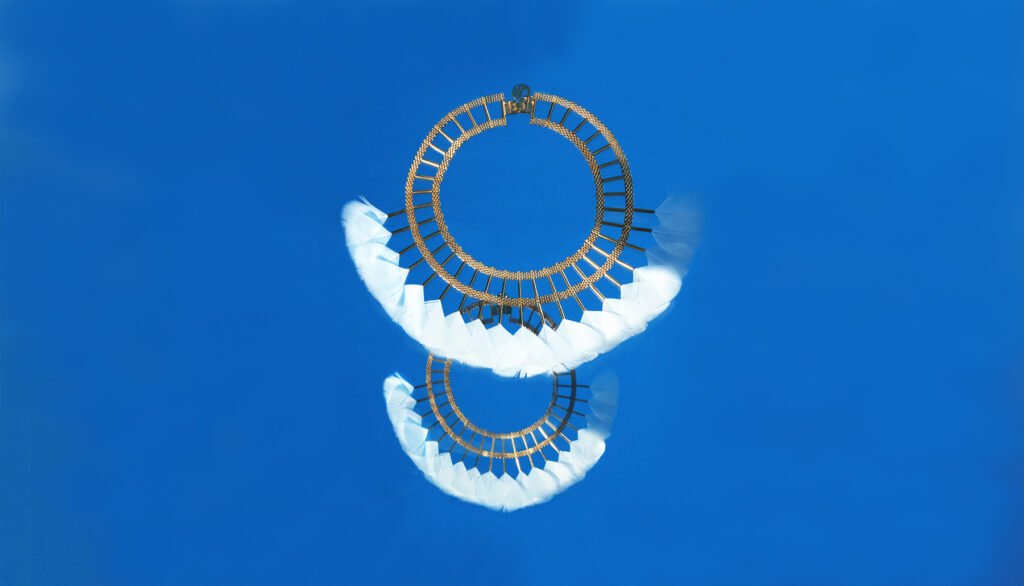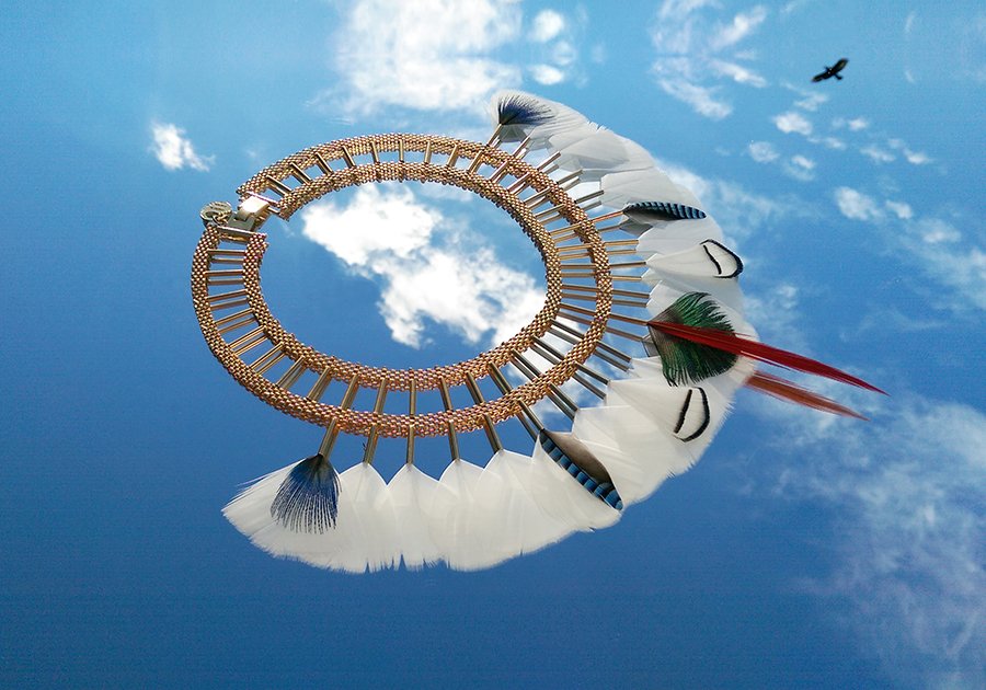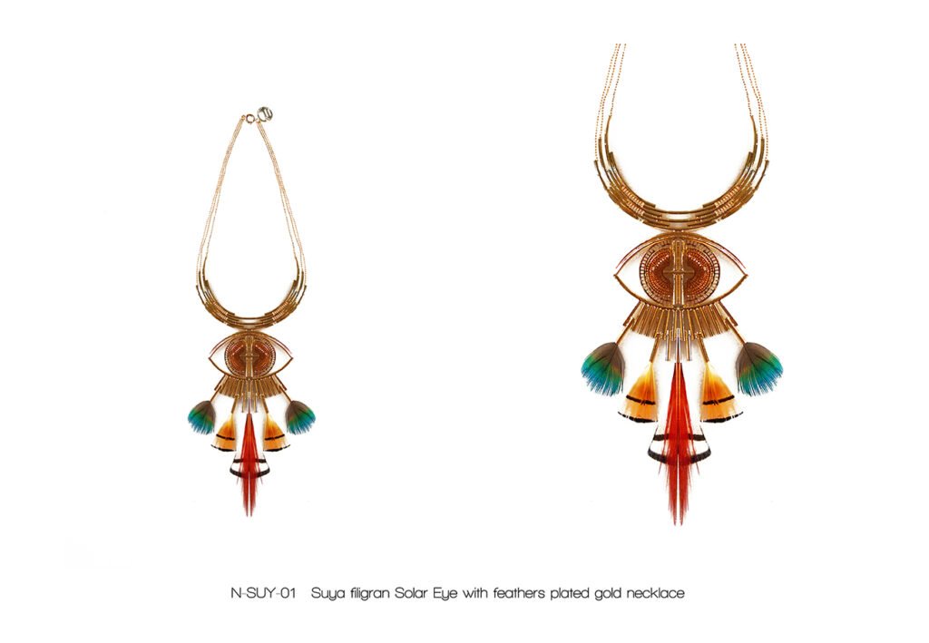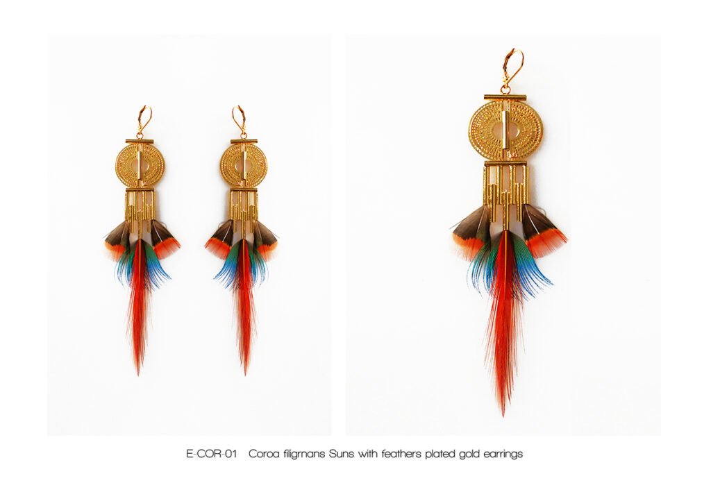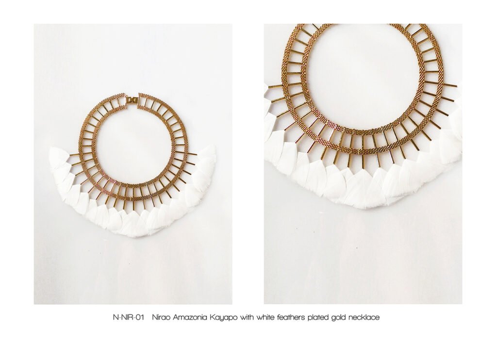 The « Kayapo Amazonia » collection is a tribute to the Amazonian Indians and their beautiful feather headdresses, symbol of knowledge and spirituality. The Kayapo and other tribes living in the Amazon rainforest are today part of the conservative peoples of our planet Earth. My tribute tends to highlight the beauty of their gesture.