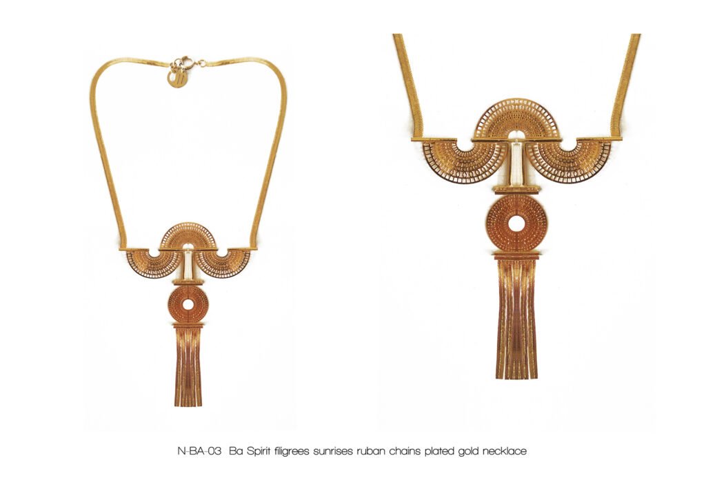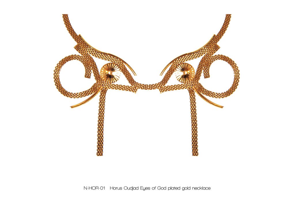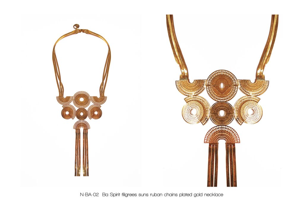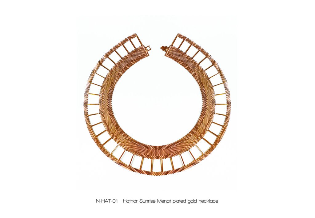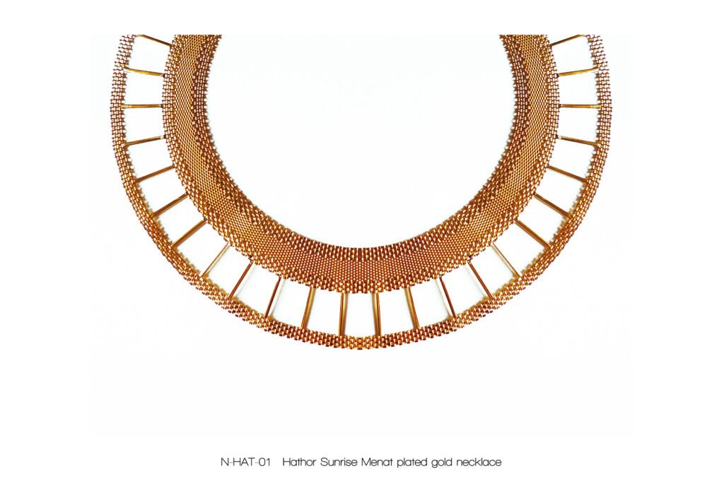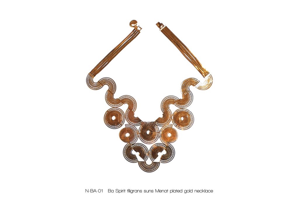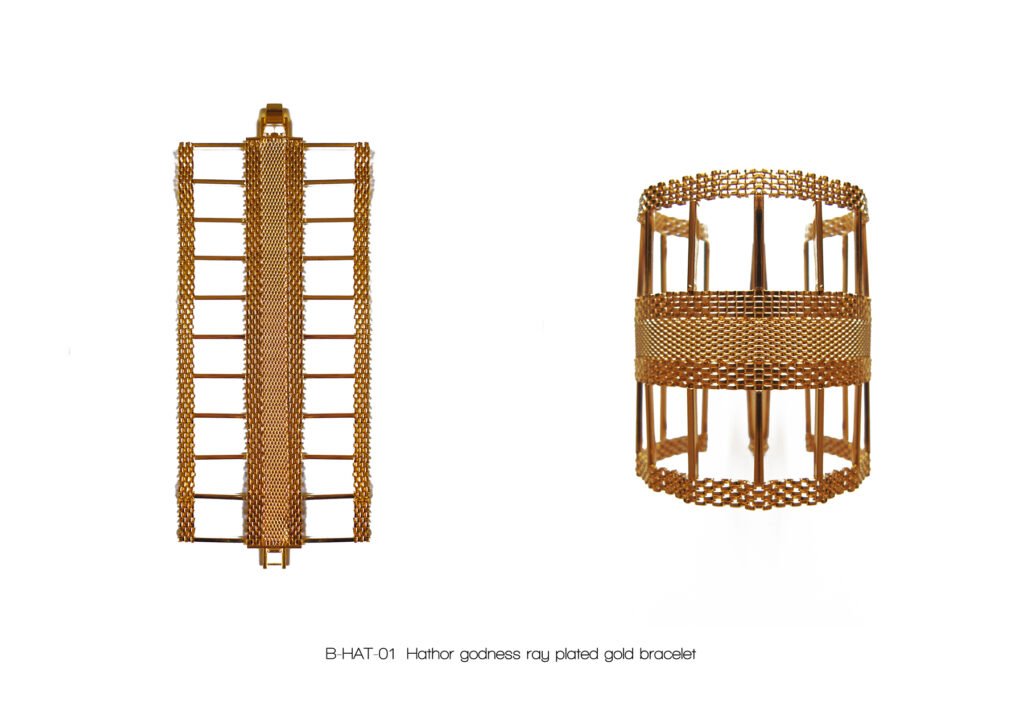 À l’image de la déesse Hathor, œil de RÊ, qui arbore majestueusement le disque solaire, Marie entremêle avec grâce ces fines chaînes qui ne sont pas sans évoquer sa chevelure de soie, dont les nombreux filaments de lumière sont autant de rayons autour du soleil.