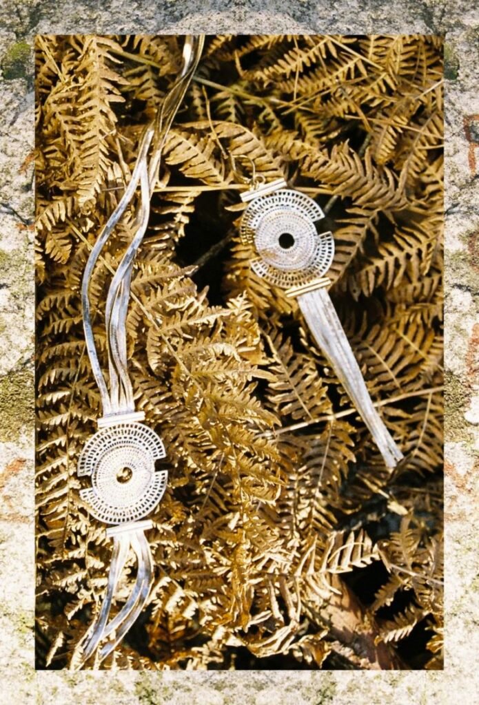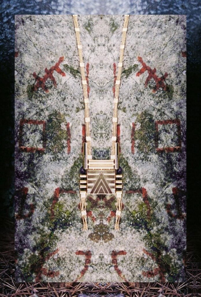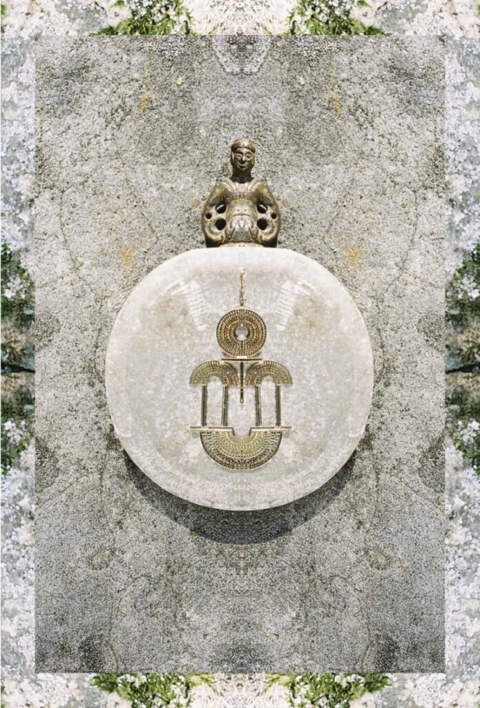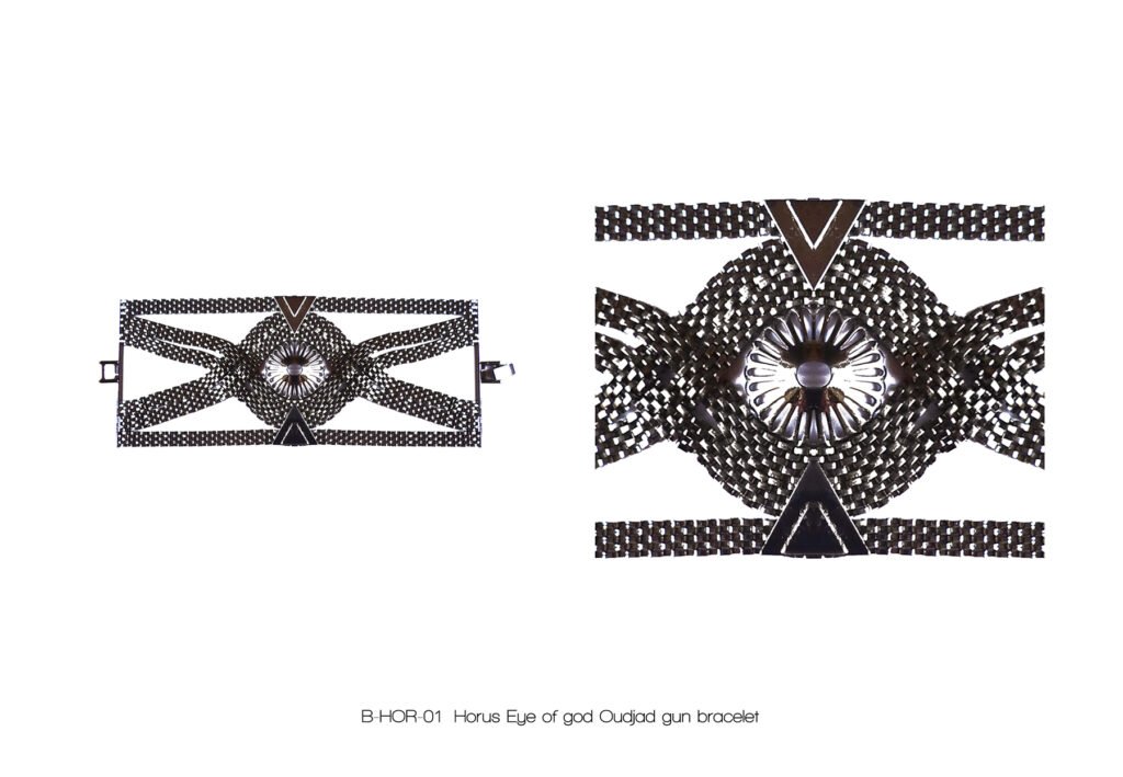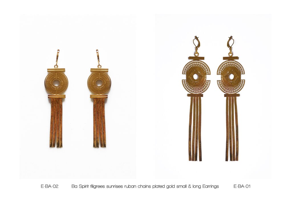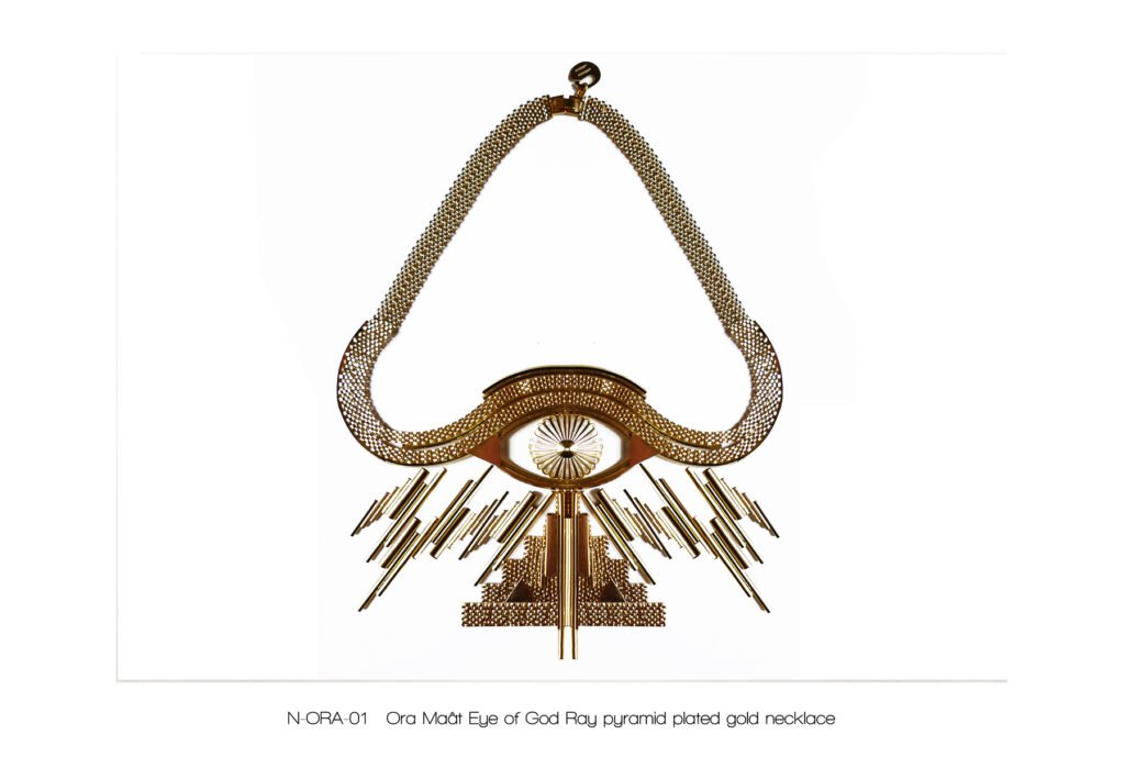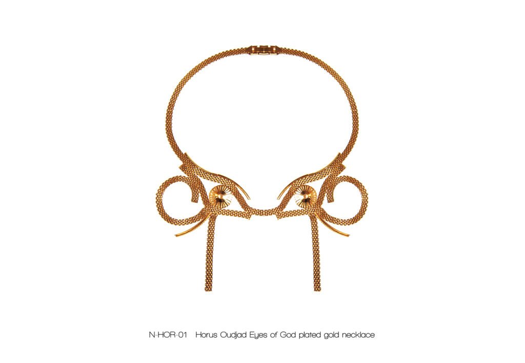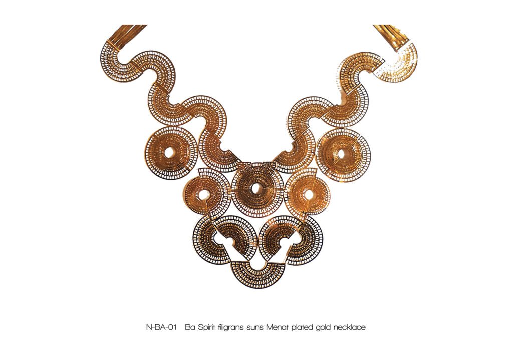 À l’image de la déesse Hathor, œil de RÊ, qui arbore majestueusement le disque solaire, Marie entremêle avec grâce ces fines chaînes qui ne sont pas sans évoquer sa chevelure de soie, dont les nombreux filaments de lumière sont autant de rayons autour du soleil.
