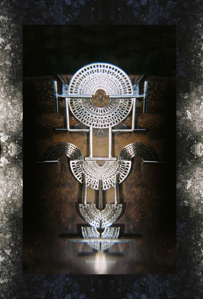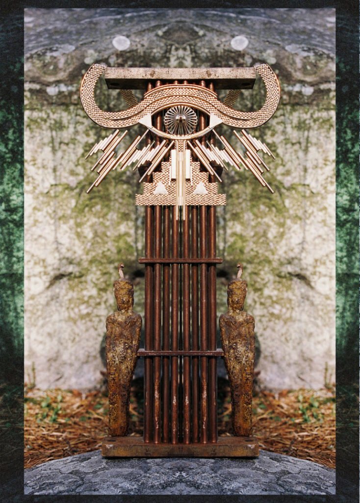 La symétrie de ses créations dévoile le pilier DJED, arbre sacré pourtant ancré dans la terre, image de la colonne vertébrale humaine. Apportant la stabilité nécessaire à l’homme pour que son âme, KA, puisse exister autour de son corps, il permet au mortel de se dédoubler de part et d’autre de son centre, déployant ainsi telle ISIS, ses ailes éternelles.